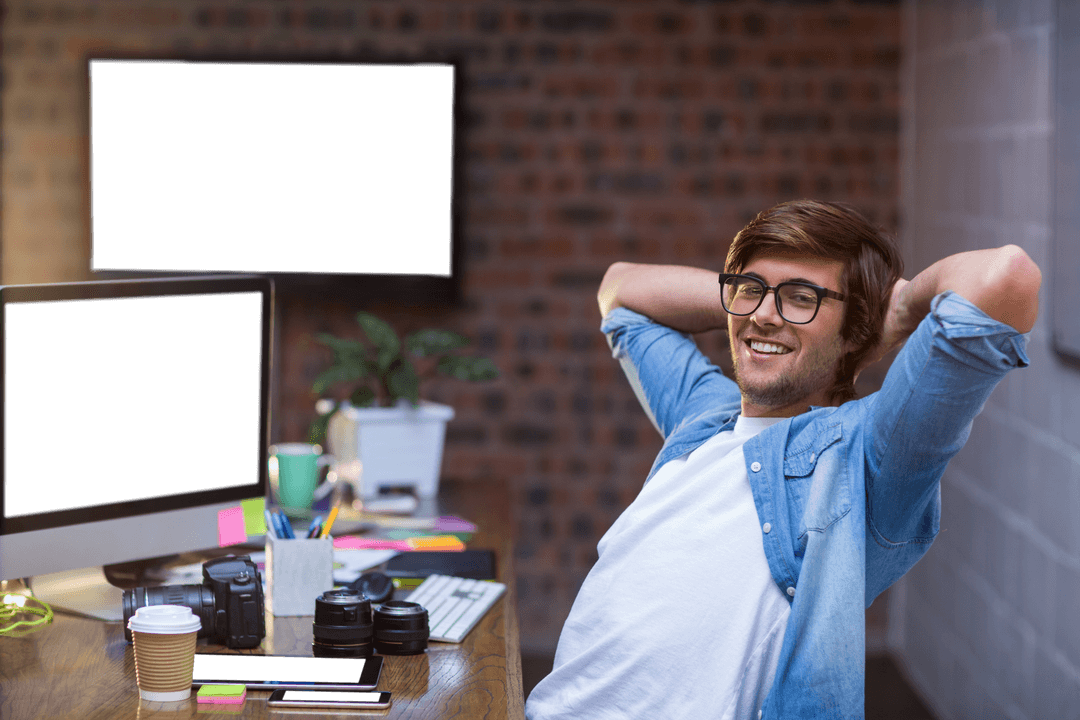Young man is sitting casually at his desk, hands behind his head, looking content and relaxed. His workspace features two digital screens, various tech gadgets, and a plant, suggesting a modern, digital-focused environment. Ideal for illustrating themes of work-life balance, creative professions, or freelancing.