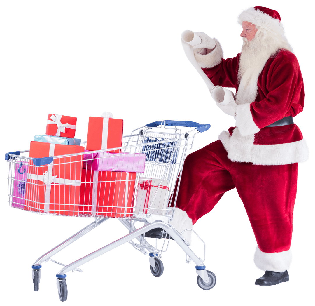 Santa Claus joyfully checking list beside shopping trolley filled with Christmas gifts on transparent background. Ideal for holiday-themed graphics, festive advertisements, marketing materials depicting seasonal shopping, or Merry Christmas greetings in promotional content.