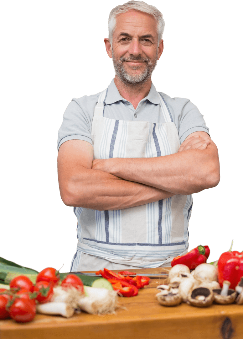- Senior Man Cooking with Fresh Vegetables on Transparent Background