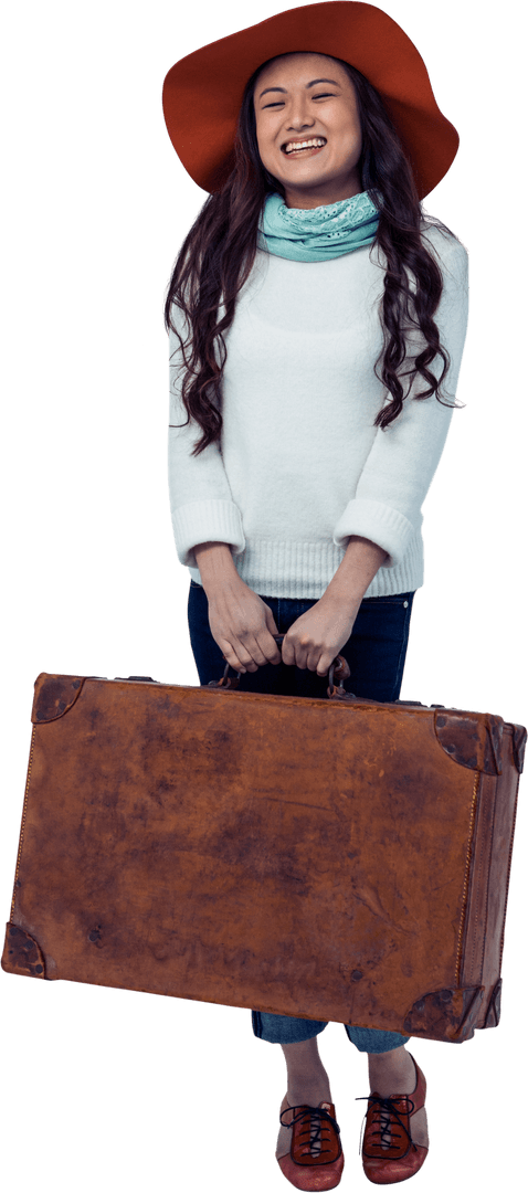 Perfect for travel-themed designs, this image showcases a cheerful Asian woman with vintage luggage, allowing flexible placement due to the transparent background. Ideal for use in travel promotions, lifestyle blogs, and packing tips articles.