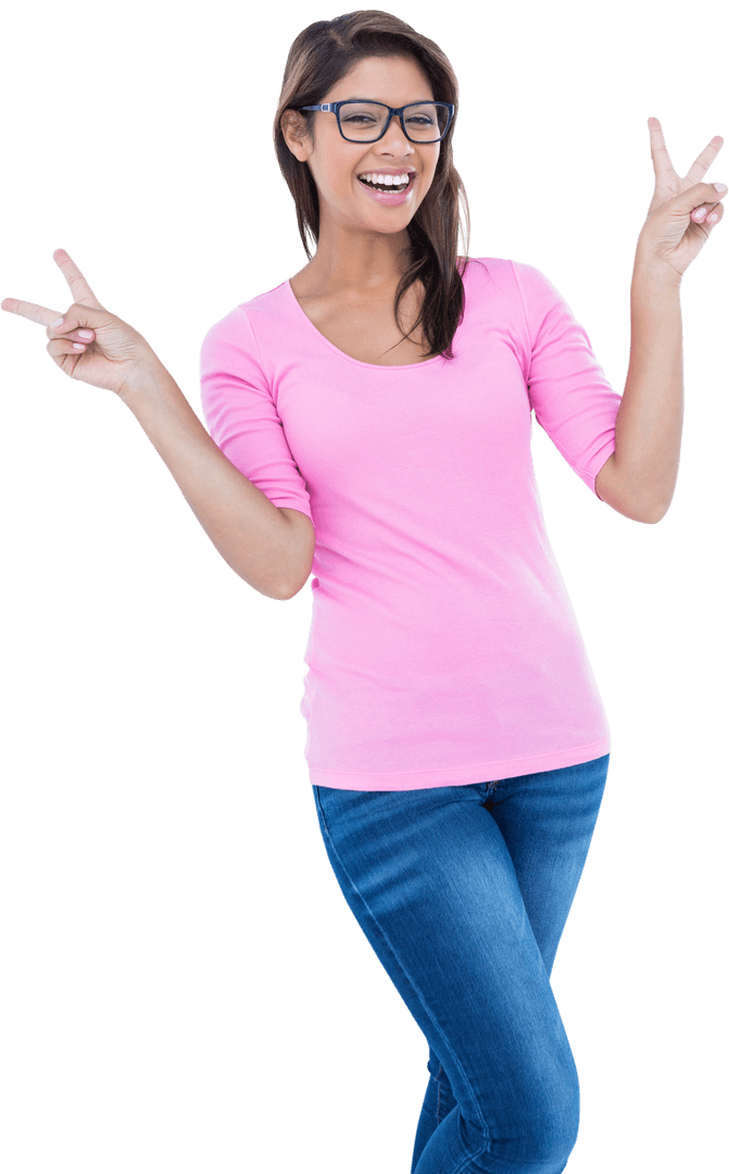 Young woman wearing glasses is smiling and showing a peace sign with both hands. She is dressed in a pink shirt and jeans, exuding a confident and joyful vibe. Perfect for promoting eyewear, lifestyle campaigns, or cheerful advertisements with a transparent background useful for seamless integration in various designs.