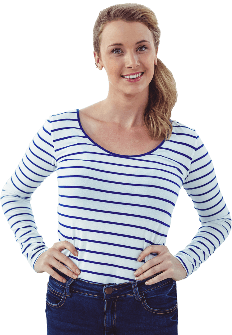 This image of a smiling woman in a striped shirt and jeans with a transparent background is perfect for promotional materials, corporate brochures, fashion blogs, or lifestyle advertisements. The transparent background makes it easy to blend into different designs.