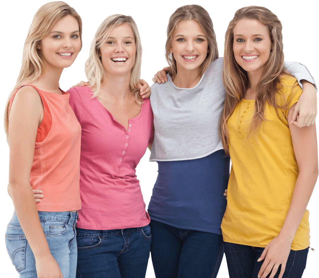 This image features four young women smiling and embracing, symbolizing friendship and joyful bonding. The transparent background allows for versatile use in promotional materials, web design, or as an overlay in ads focusing on social interaction, events, or lifestyle themes.