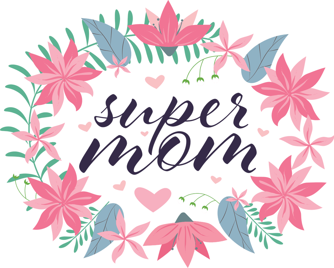 This illustration features 'Super Mom' text surrounded by a decorative floral wreath on a transparent background. Pink flowers and green foliage enrich the elegant design. Suitable for Mother's Day cards, invitations, or personalized gifts, this vector can enhance your creative projects by adding a touch of celebratory warmth.