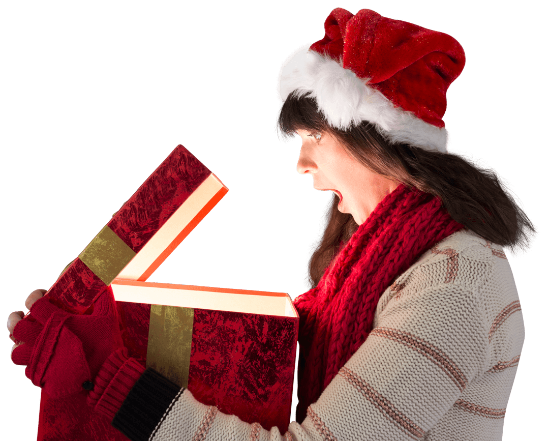 Brunette wearing Santa hat and winter scarf is opening a glowing Christmas present with astonishment and joy. This transparent background image is perfect for holiday greeting cards, festive promotions, gifs, banner ads, or website decorations celebrating the Christmas season.