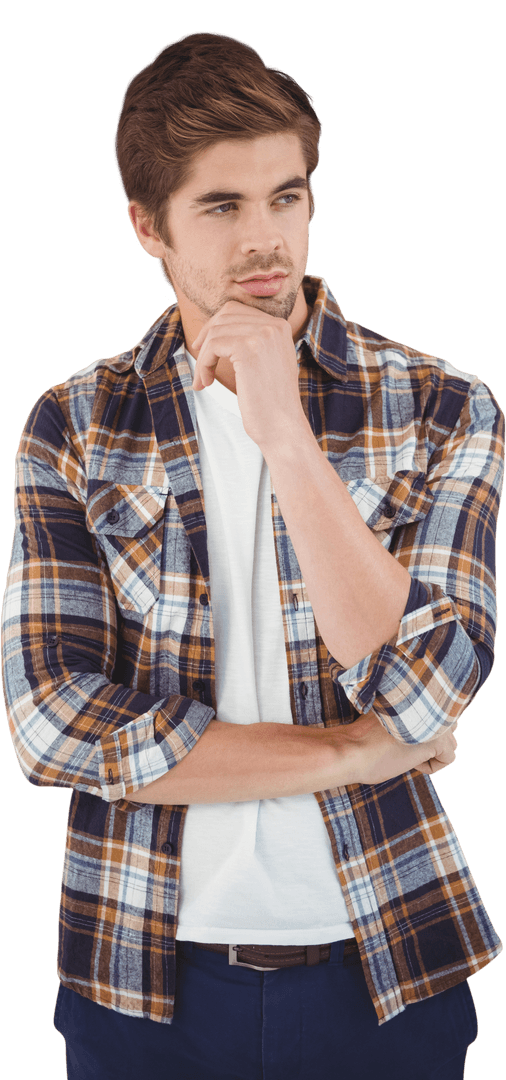 Man with brown hair wearing full plaid flannel shirt and white T-shirt, thinking with hand on chin on a fully transparent background. Suitable for social media, ads, and creative projects needing transparent images with thoughtful ambiance.