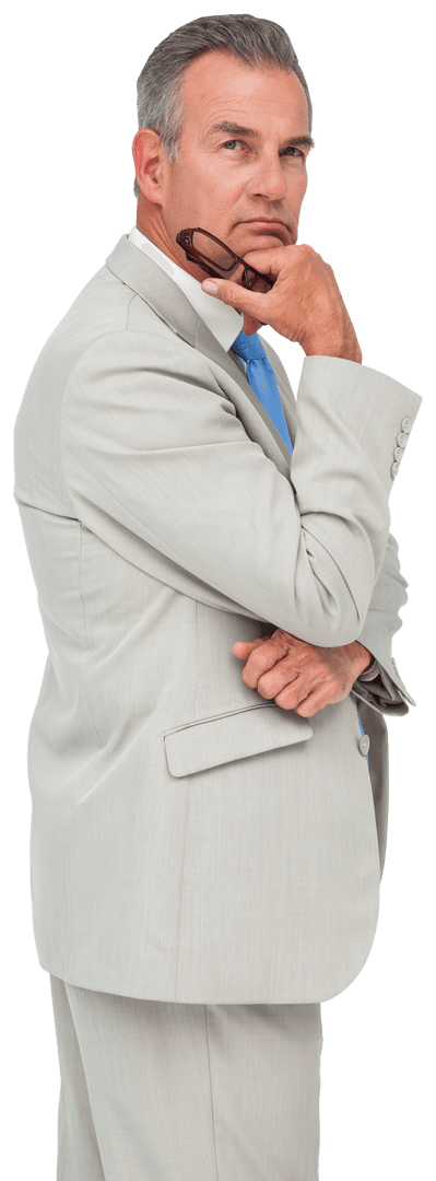 Mature businessman thoughtfully holding glasses, standing isolated with a transparent background. Perfect for business, consulting, professionalism, corporate themes, and editorial content highlighting confident leadership and decision-making qualities.
