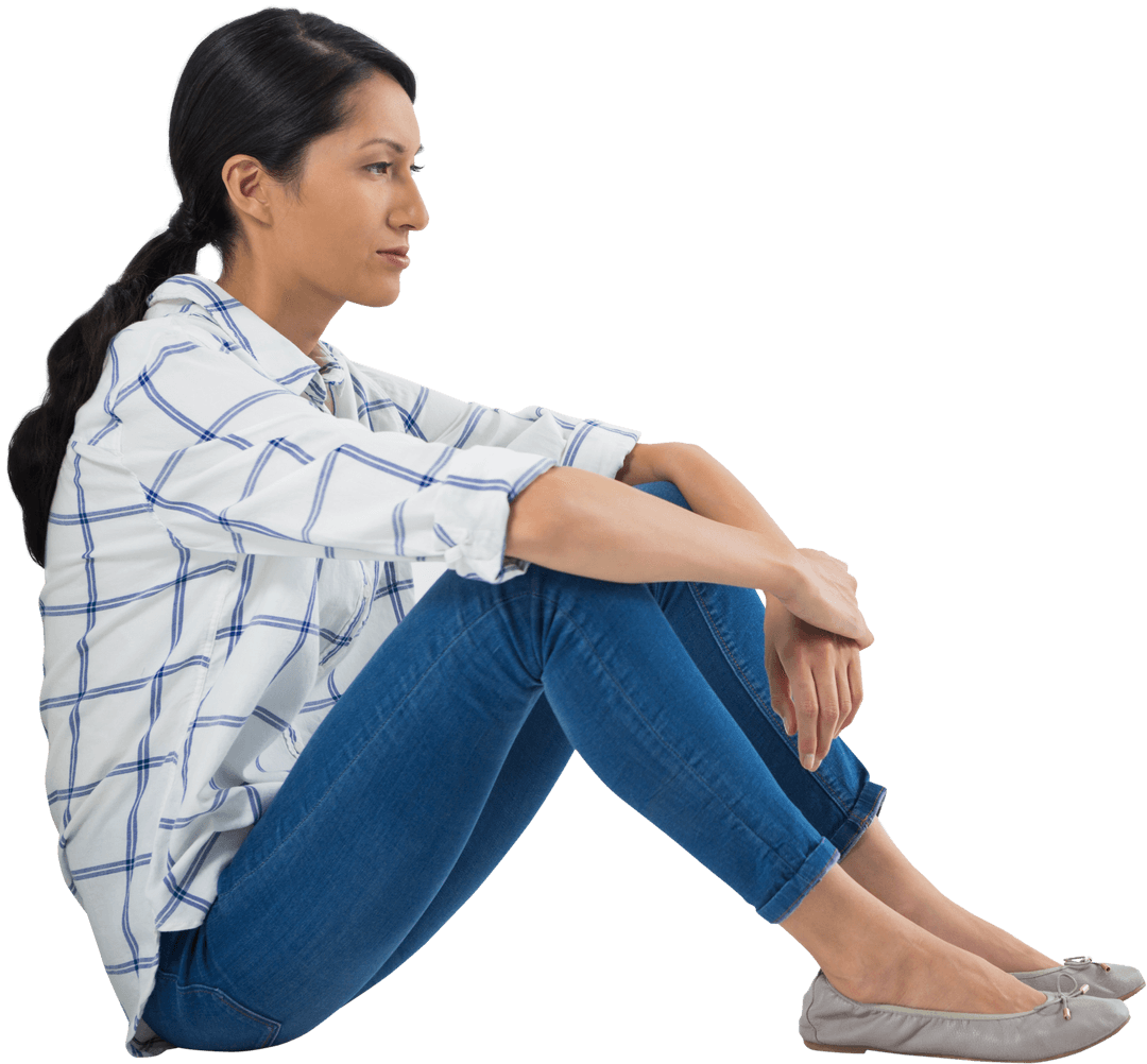 Thoughtful Woman Sitting in Casual Wear on Transparent Surface PNG