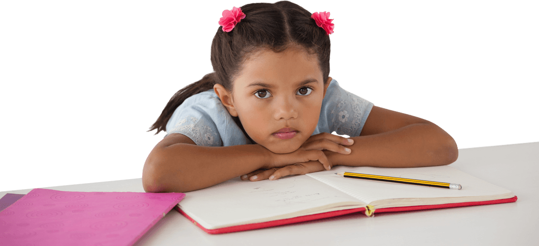 Young girl gazes thoughtfully while leaning on an open book at desk with pencil beside her. Useful for educational materials, promoting learning environments, or illustrating childhood concentration and thought. Ideal for school-related projects considering transparency requirement for design customization.
