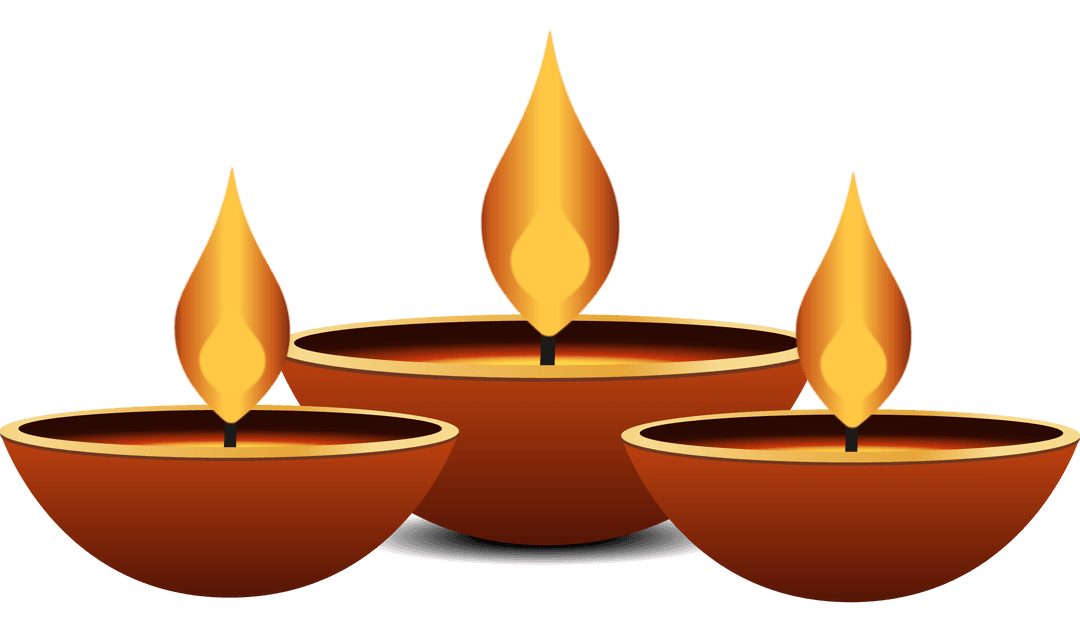 Three glowing clay oil lamps casting warm light via stylized flames on a transparent background. Perfect for celebrating cultural or spiritual events, this minimalistic design enhances festive invitations, social media graphics, or DIY decor. Ideal for illustrating traditional ceremonies and rituals with charm and elegance.