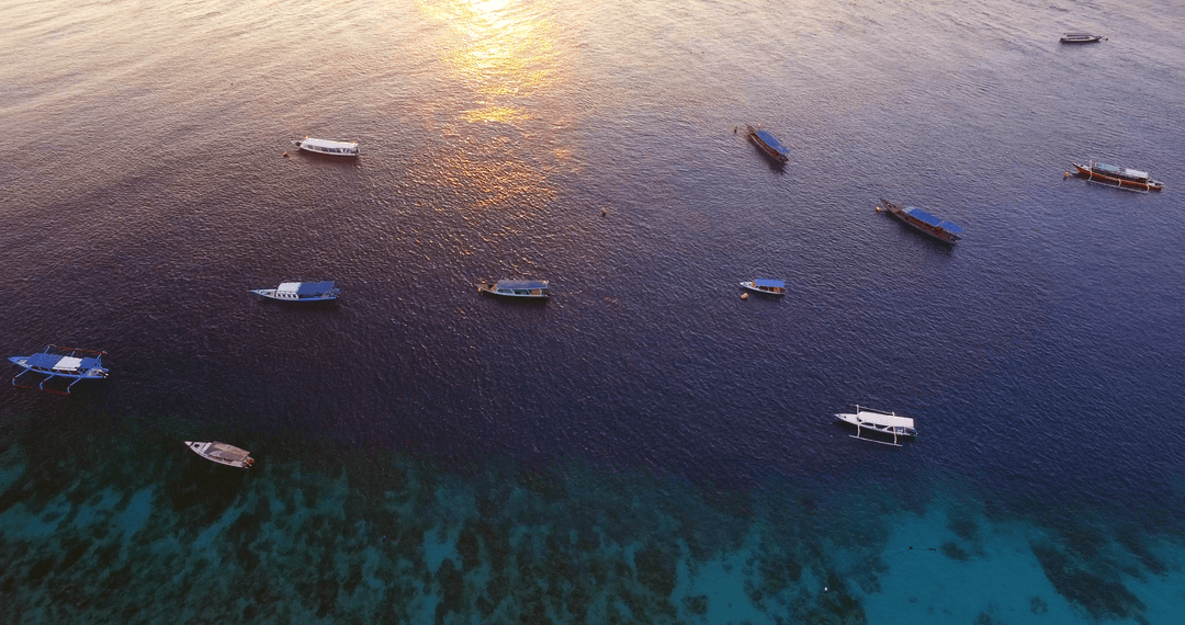 Aerial perspective capturing various passenger boats serenely positioned over a transparent sea during an enchanting sunset. Ideal for themes focusing on travel, maritime adventure, tranquility, or showcasing beautiful waterfront scenery.