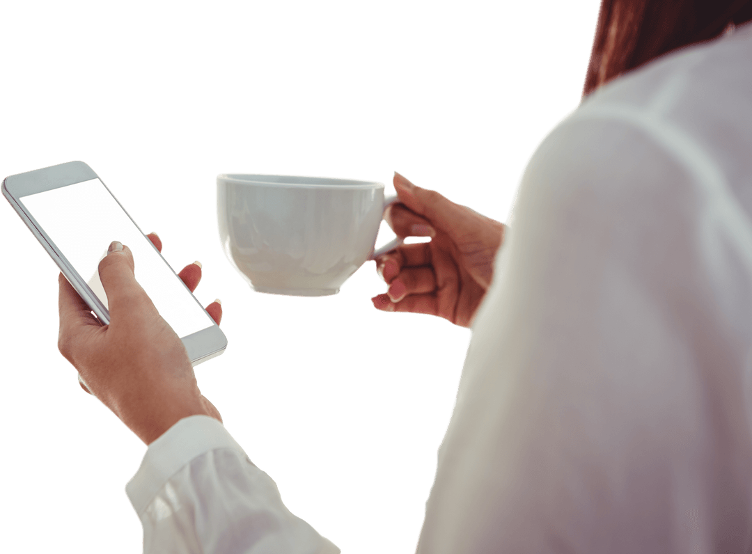Transparent Back View of Woman Holding Smartphone and Coffee Cup PNG