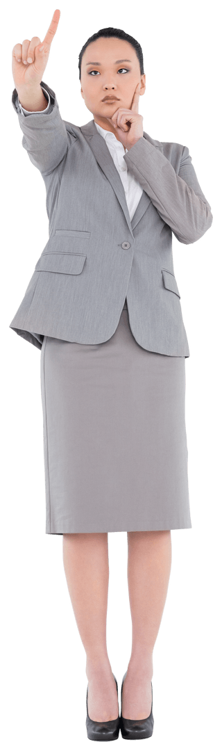 Businesswoman in formal attire deep in thought on transparent background, perfect for business presentations, educational materials, corporate or financial themed web designs. Adds a touch of professionalism and introspection across different projects.