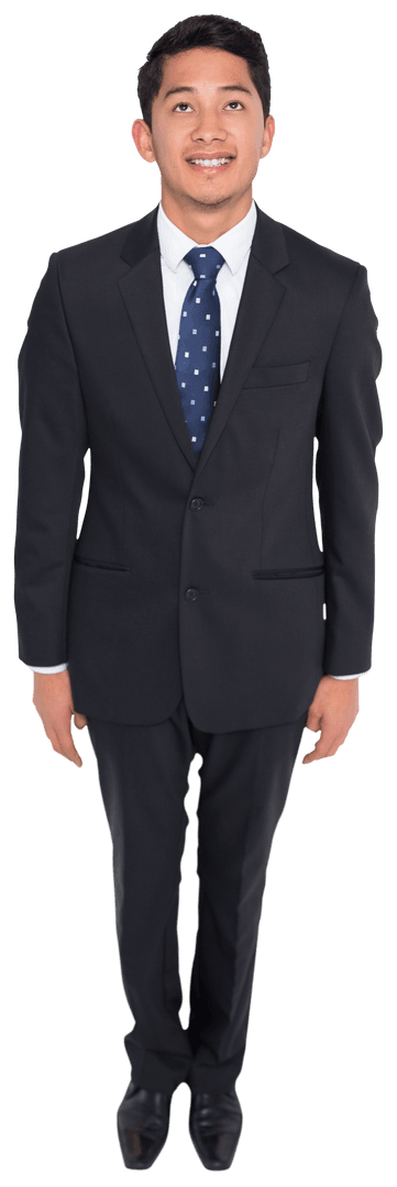 Professional in suit and tie standing full length against transparent backdrop. Ideal for business presentations, corporate branding, marketing materials showcasing positivity and professionalism.