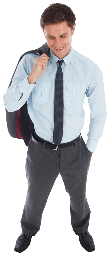 A businessman on a transparent background is holding his jacket over shoulder while smiling casually. This versatile depiction can be used for websites, advertisements, or corporate presentations to exemplify professionalism and friendliness.