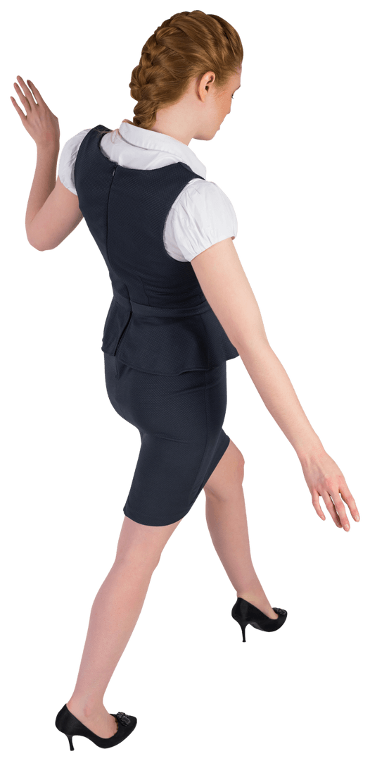 Woman in professional attire balancing with carefully outstretched arms. Ideal for concepts of stability, coordination, and achieving balance in professional endeavors. Useful in marketing materials, educational content about workplace balance, or motivational materials.