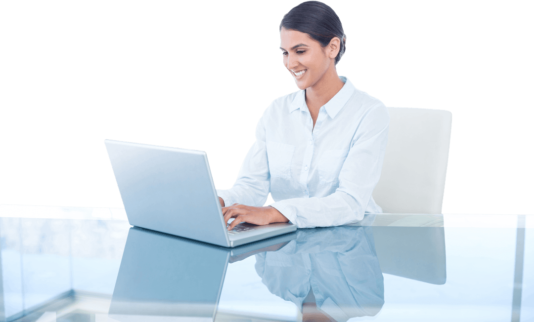 Transparent Businesswoman Typing on Laptop at Office Desk PNG