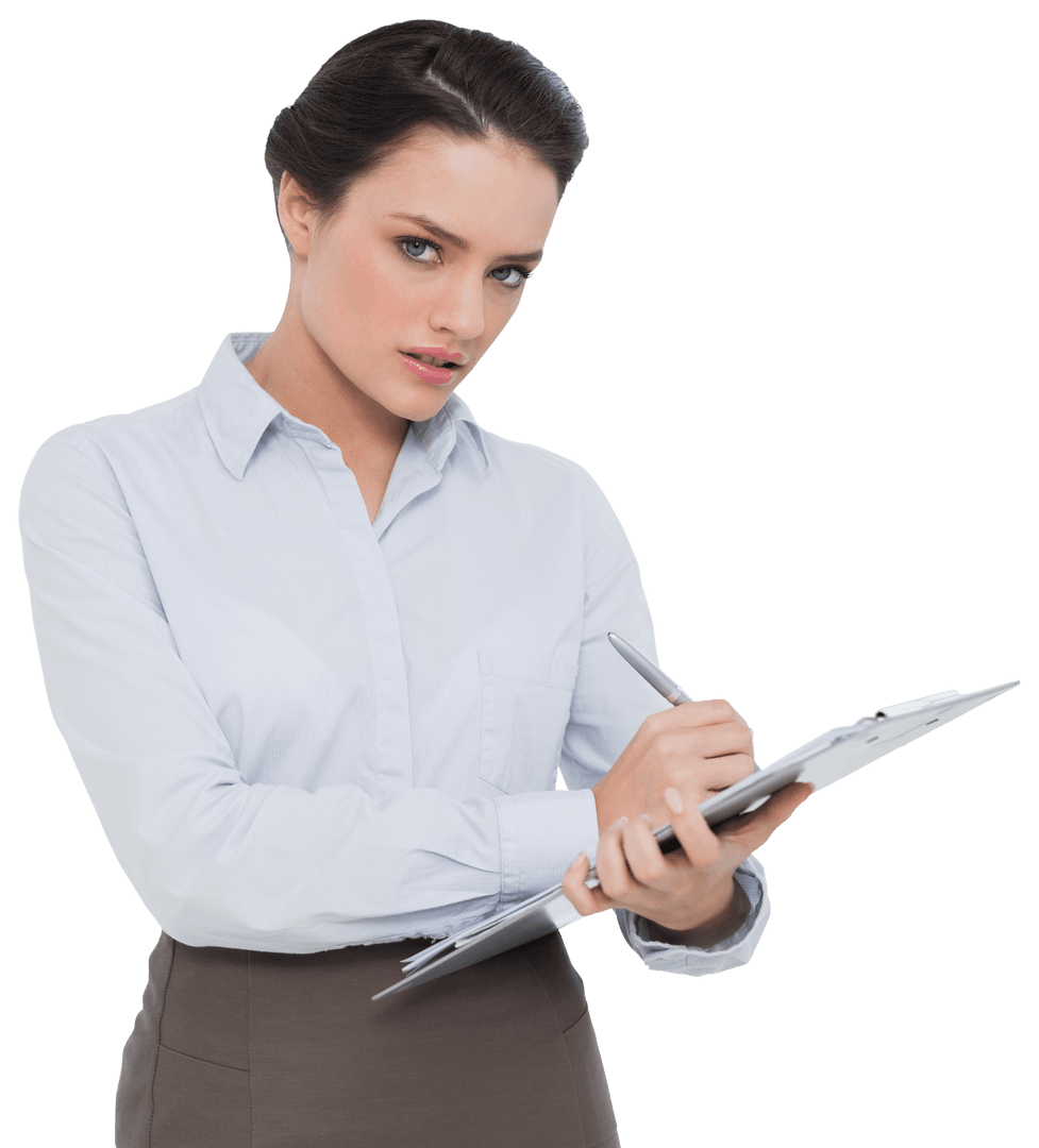 Businesswoman standing while writing on clipboard, wearing professional attire, creating determined yet approachable aesthetic. Useful for business, corporate training, administrative roles, or professional themes.