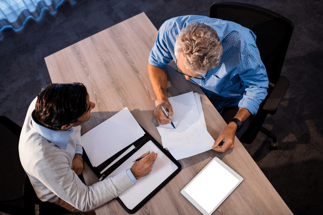 Two business professionals engaging in transparent discussion with notes and paperwork on table. Tablet and notebook providing support for brainstorming and planning activities. Suitable for illustrating concepts of teamwork, decision making, and corporate strategy.