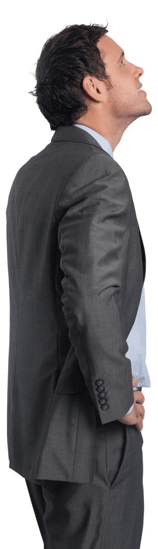 Stylish businessman wearing suit looking upward with a confident smile. Ideal for business representation, success themes, professional life images, marketing materials, leadership concepts.