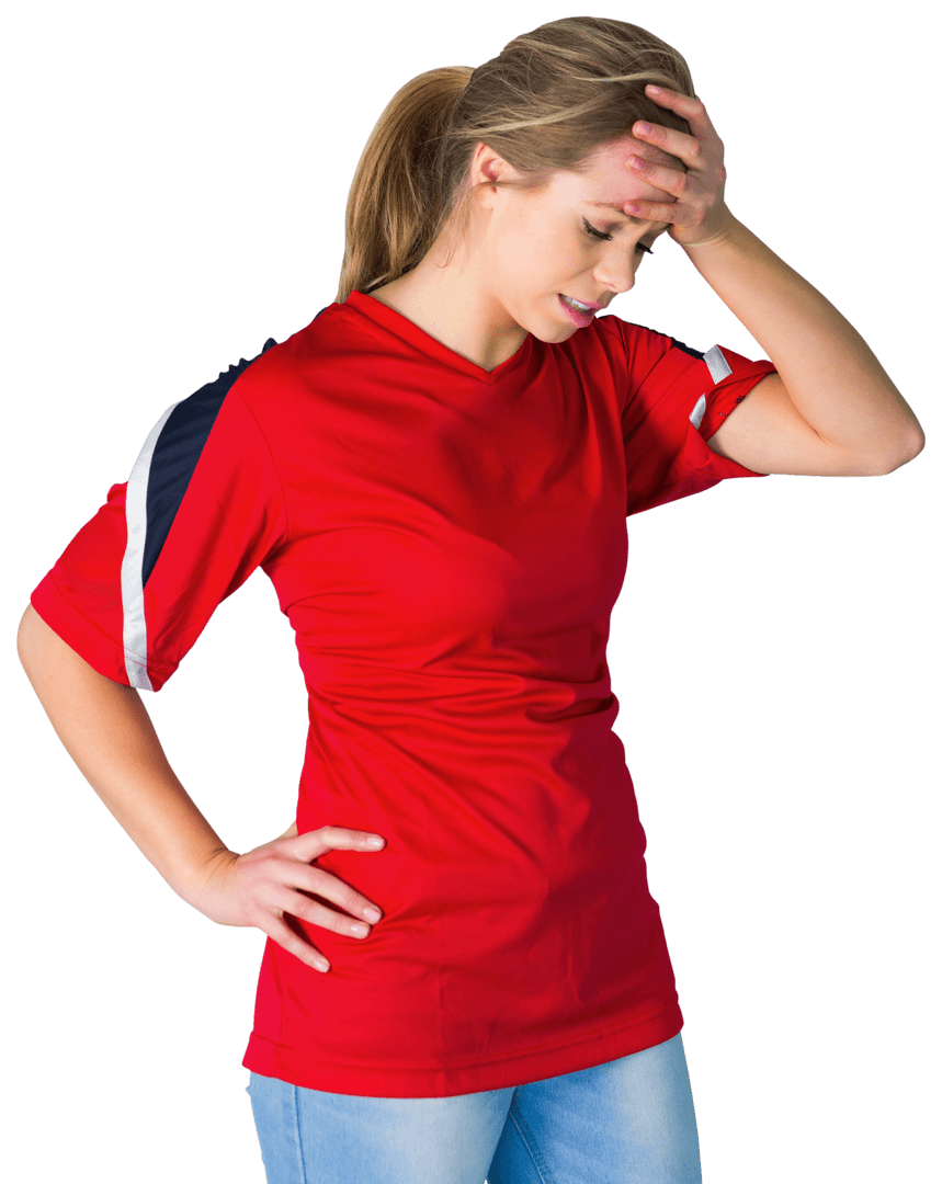 Transparent Disappointed Soccer Fan in Red Jersey Holding Head PNG