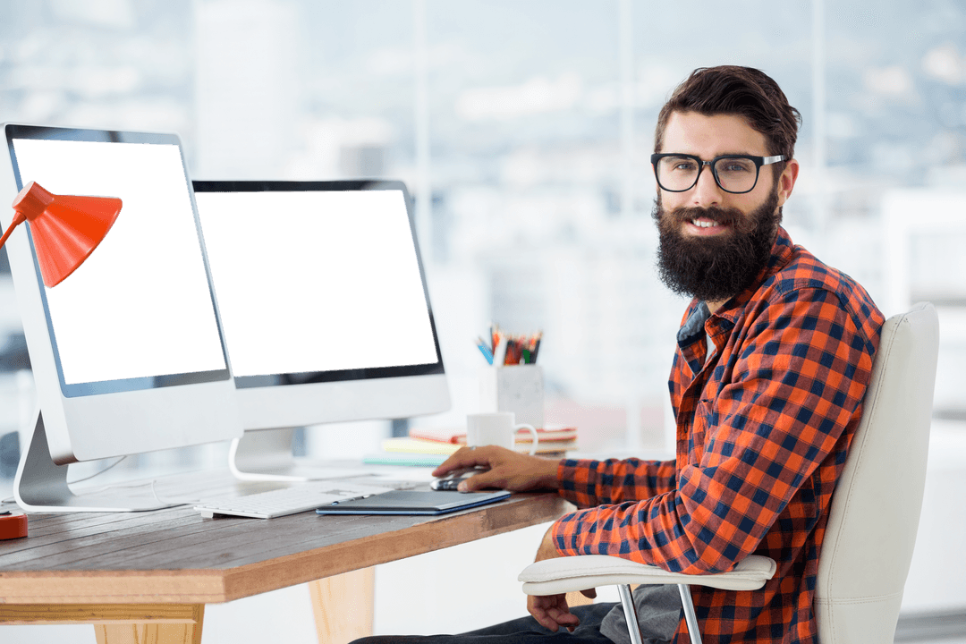 Businessman sitting at modern office desk, using computer with blank screens and smile. Suitable for illustrating business environments, work lifestyle promotions, digital product development visuals, and office decor ideas.