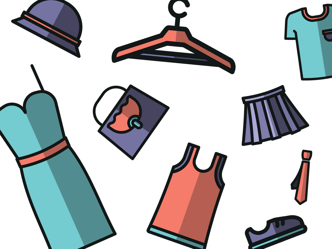Illustration features variety of fashion items including dresses, sneakers, hats, and accessories, all depicted upon transparent background. Suitable for design projects needing stylish, modern flair, textile designs, or fashion marketing materials showcasing diverse apparel elements.