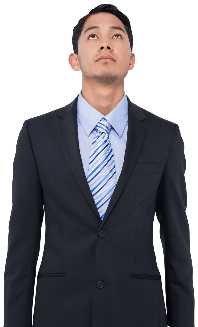 Image of an Asian businessman wearing a formal suit, staring intently upwards on a clear, transparent background. Ideal for use in business goals presentations, leadership articles, and career-focused branding, symbolizing upward focus and strategic planning.