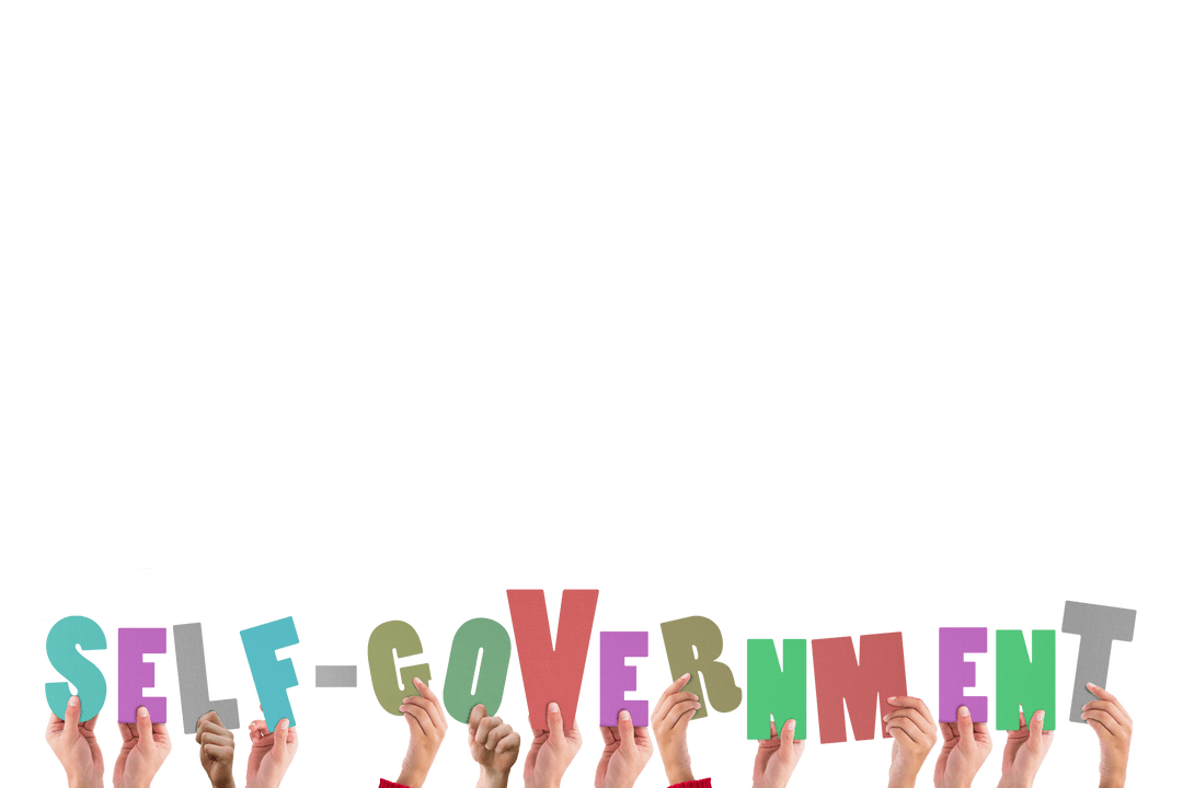 Various hands are raised holding colorful signs spelling 'self-government', signifying collaboration, empowerment, and community involvement. This can be used for illustrating concepts of leadership, independence, and collective responsibility in social, organizational, or educational materials.