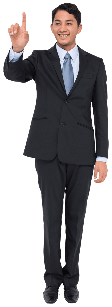 Asian businessman in formal attire confidently pointing, highlighting concepts like leadership, decision-making or growth. Perfect for illustrating business success, professional confidence and teamwork in presentations, marketing materials, or business websites.