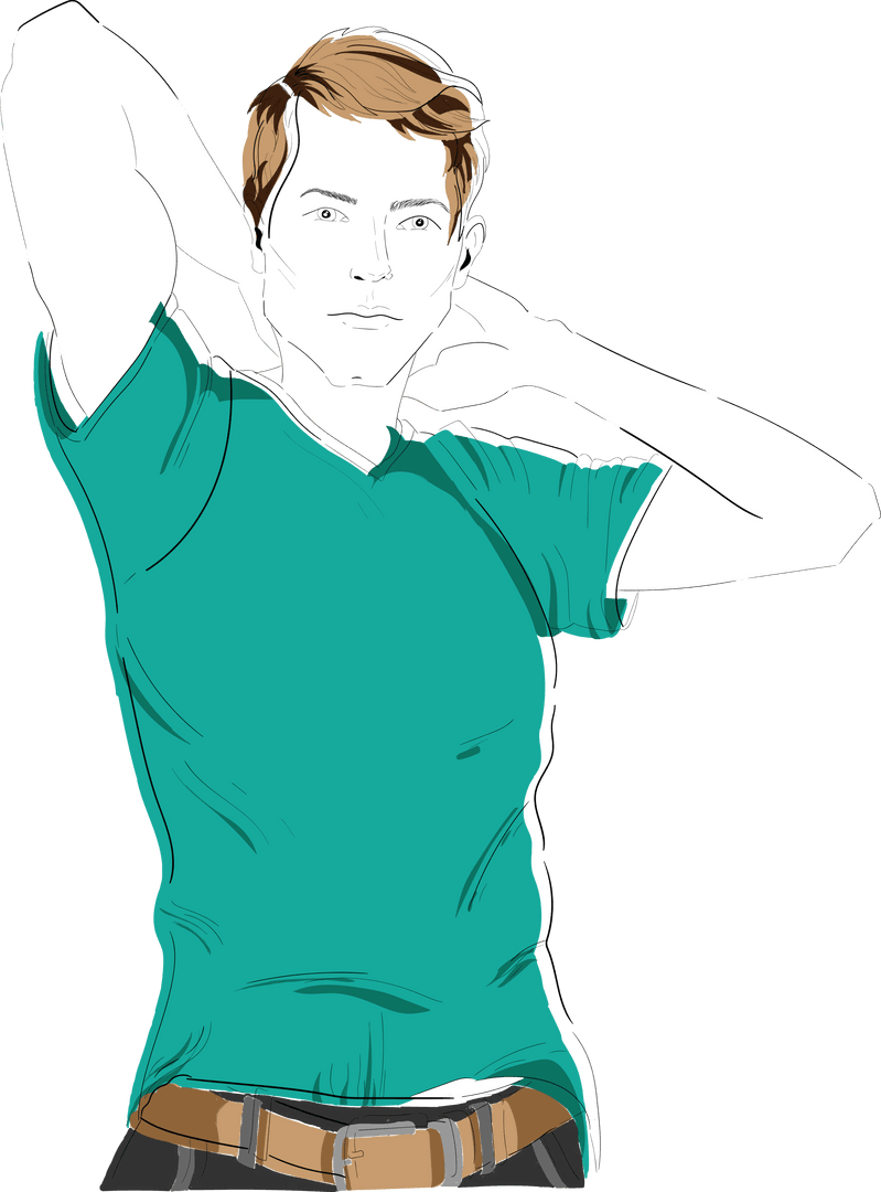 This digital illustration shows a confident male figure in a relaxed pose with arms behind his head. Perfect for use in blogs or articles discussing fashion, confidence, or lifestyle. Its transparent background makes it easy to use in design projects or as an overlay with other images or text elements.