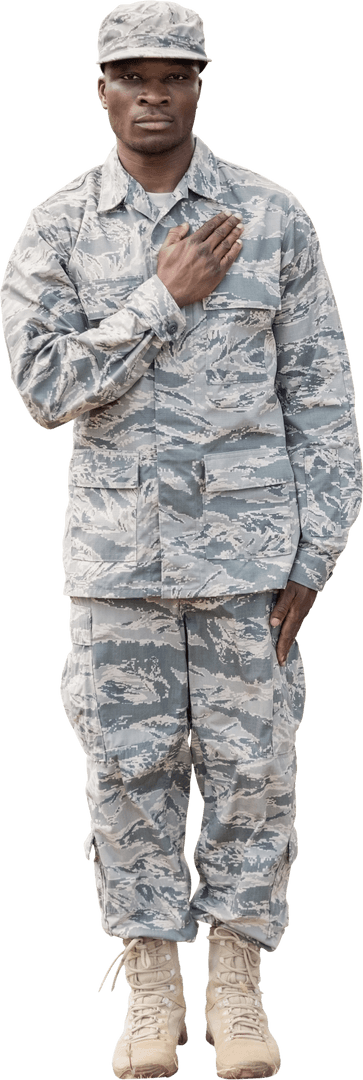 Depicting a military soldier in camouflage uniform swearing a solemn salute. Well-suited for use in contexts related to military service, respect, and discipline. Ideal for educational or informational materials focusing on army traditions and ceremonies.