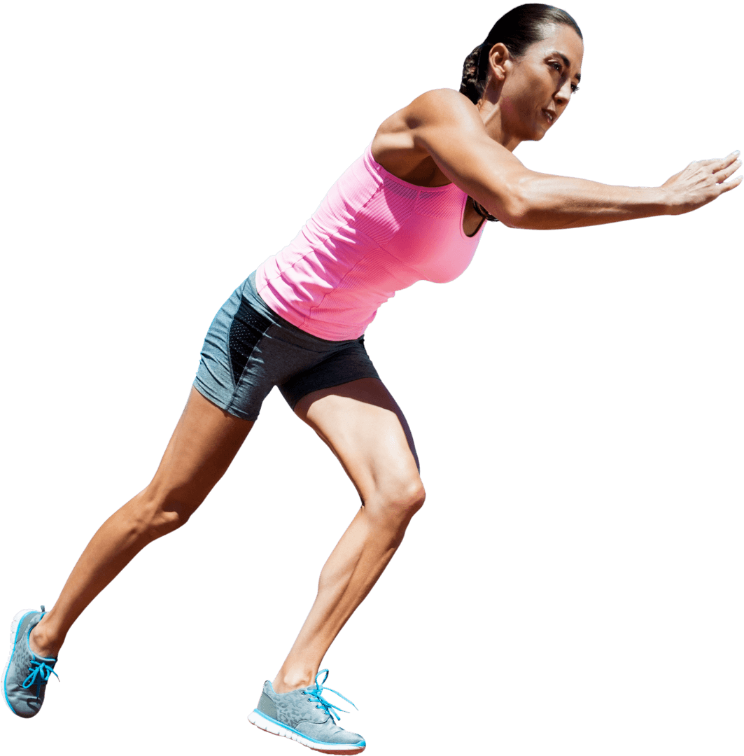 This image of a female runner captured in an athletic action pose against a transparent background is ideal for fitness and sports platforms. Designers can use it for websites, social media posts, flyers promoting exercise programs, or health and wellness applications. The energetic stance embodies motivation and a healthy lifestyle, connecting well with products or services related to physical activity.