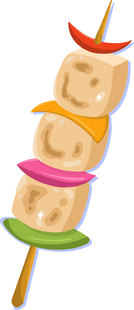 The illustration features a simplistic and vibrant depiction of a vegetarian skewer, with beige cubes and multicolored disks visually stacked on a wooden skewer. This creative representation adds a playful touch often used in culinary advertisements, cookbooks, and recipe blogs. Ideal for use as an eye-catching graphic that emphasizes healthy eating or enhances presentations about food culture and vegetarian options.