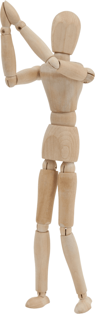 Wooden mannequin standing with arms raised, hands together, offering versatile applications for art tutorials, design references, educational materials. Useful for illustrating human postures in drawings and paintings.