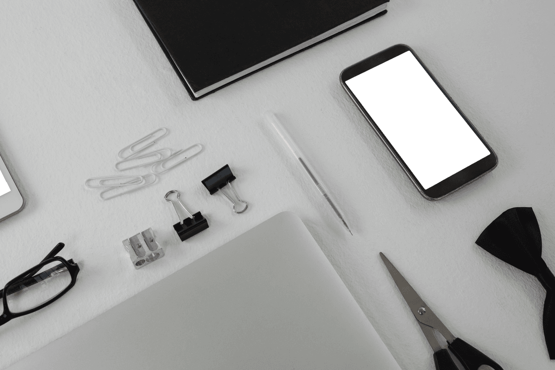 Top view of a desk featuring office supplies like a smartphone, notebook, paper clips, pen, and scissors on a transparent surface. Ideal for illustrating office work environments, productivity themes, organizational setups, or promoting stationery or tech gadgets in blogs, websites, and advertisements.