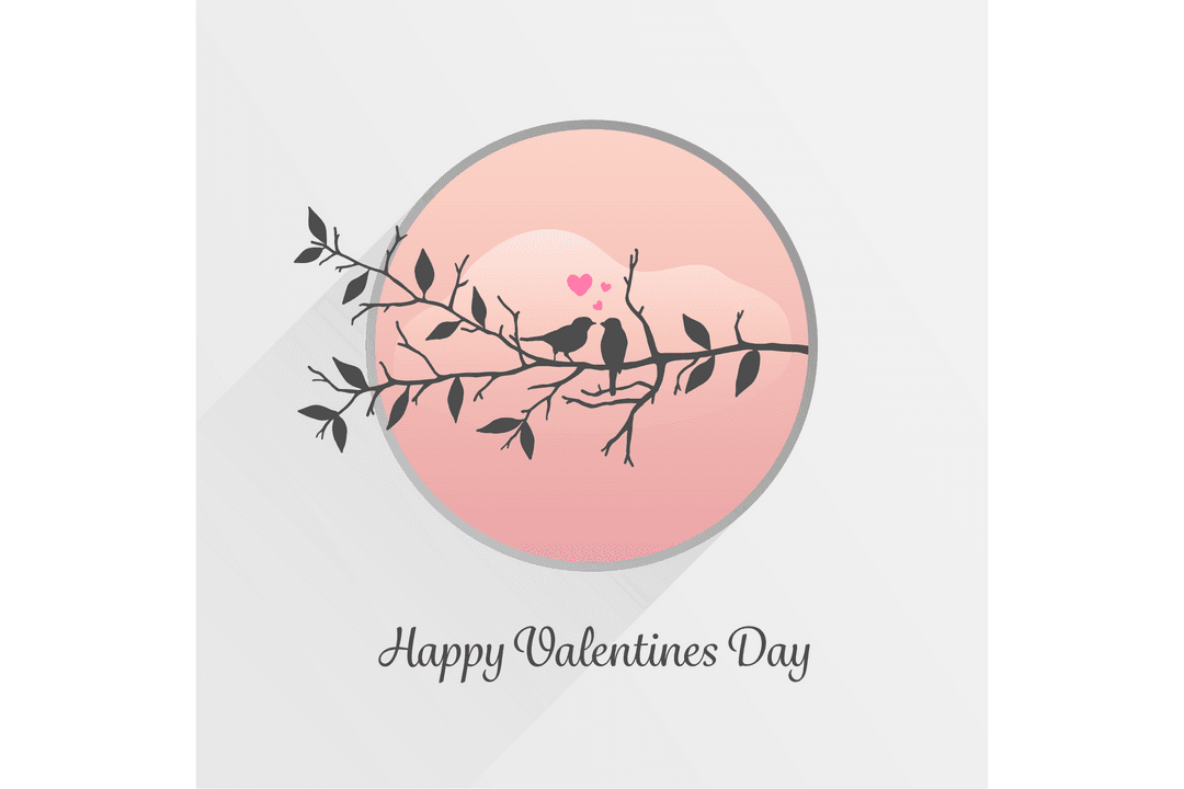 Digital illustration showing two birds perched on a branch inside a pink circle, symbolizing love and connection. Complemented by modern typography stating 'Happy Valentines Day', ideal for greeting cards, social media graphics, or festive event decorations. Perfect representation of romance on a transparent background allows versatile use across digital platforms and print designs.