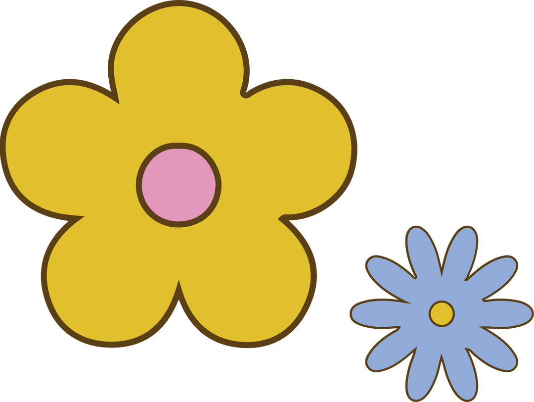 Design features yellow five-petal bloom and blue eight-petal flower on clear background. Ideal for use in graphic design, digital media, or textile patterns where a fresh and lively floral element adds charm and vibrancy.