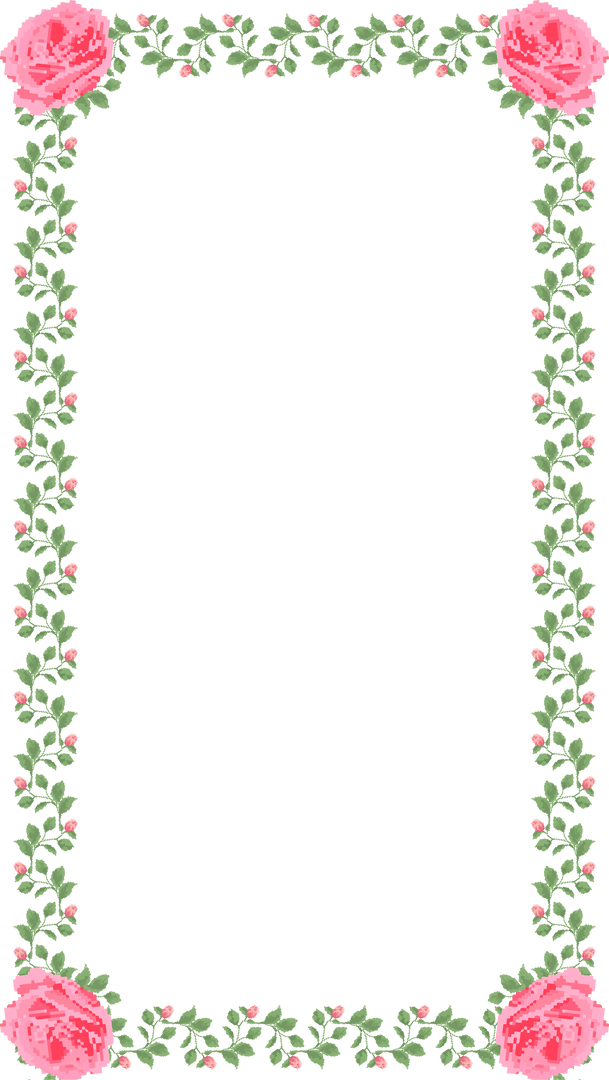 This pixel art features a vintage-inspired frame adorned with vine leaves and pink roses on a transparent background. Ideal for personalizing invitations, greeting cards, or digital scrapbooking. The intricate border design provides a charming and nostalgic touch, appealing for projects emphasizing a natural or floral motif.