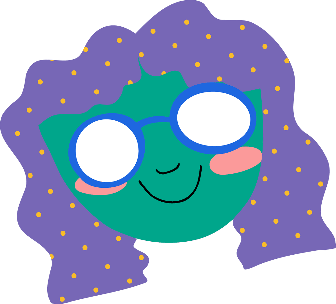 This illustration features an abstract, cartoon face with expressive blue glasses and vibrant purple hair adorned with yellow dots. The character's design includes a joyful expression with pink blushed cheeks, floating on a transparent background. Ideal for children's content, creative scenes, playful design projects, or adding a whimsical touch to graphic art. Perfect for use in branding where a cheerful and approachable aesthetic is desired.