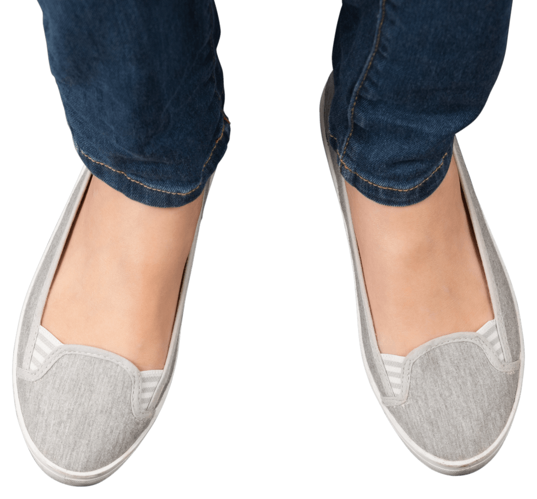 Featuring woman's feet in stylish gray flat shoes with jeans, this image is perfect for clothing and footwear advertisements, fashion websites, or casual wear catalogs. The transparent background allows for seamless integration into existing designs where focus is on highlighting fashion products or shoe design.