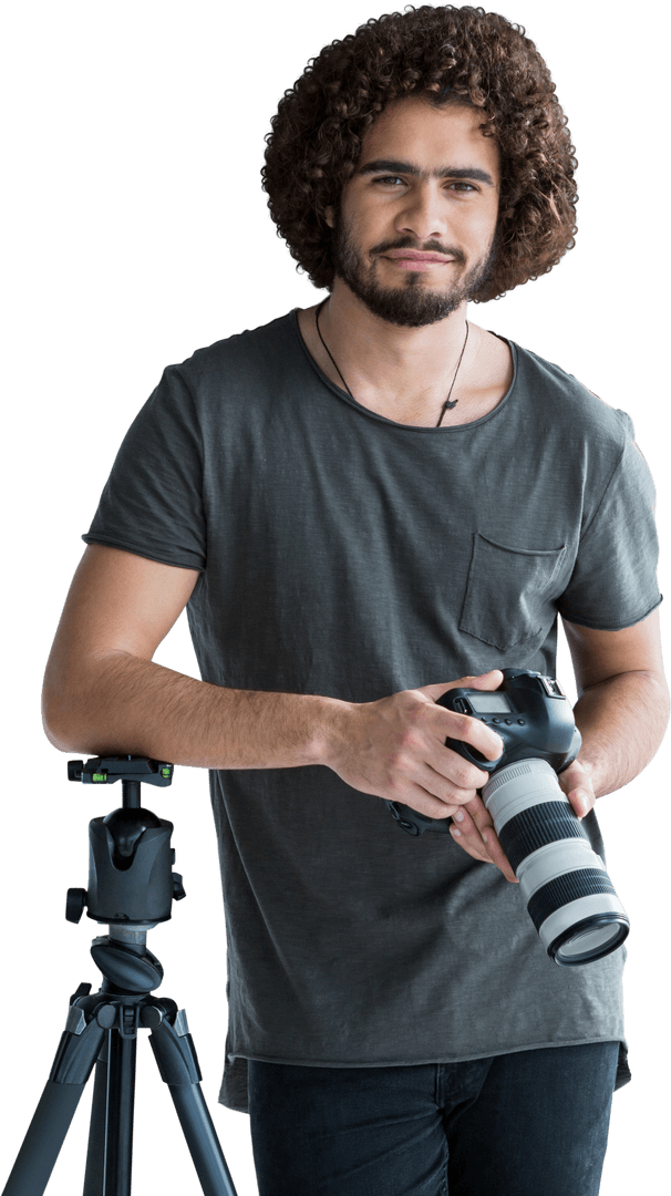 Portrait depicts young male photographer holding a digital camera with a mounted tripod beside him on a transparent background. Casual outfit and relaxed expression suggest a creative, approachable demeanor. Ideal for use in creative campaign ads, photographer testimonials, or educational contents related to photography tips and tricks.