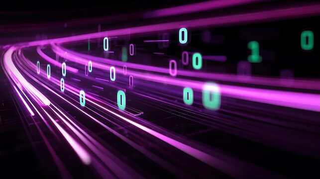 An artistic representation of a binary code stream with ones and zeros cascading down in a stylized pattern, illuminated in orange against a deep blue.