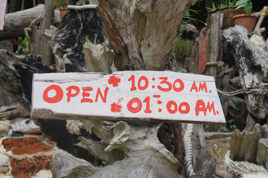 A white wooden vintage sign with red lettering says open from 10:30 a.m. to 1:00 a.m.