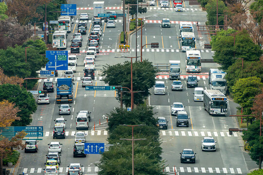 Fukuoka City, Japan - 02 December 2025: Aerial view of Taihaku-dori Avenue pulses with life, a vibrant river of cars and buses flowing between verdant trees and clear skies.