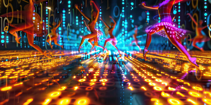 The Binary Ballet: Dancers twirling through the air, leaving behind trails of 0s and 1s on a glowing digital floor.