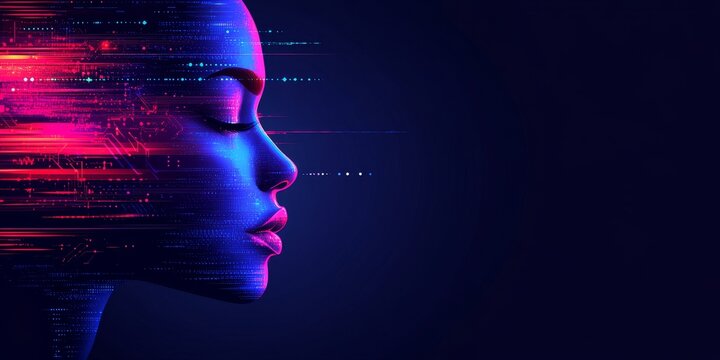 Human Face Outline Intertwined with Digital Circuits, 1s and 0s against a Midnight Blue Backdrop.