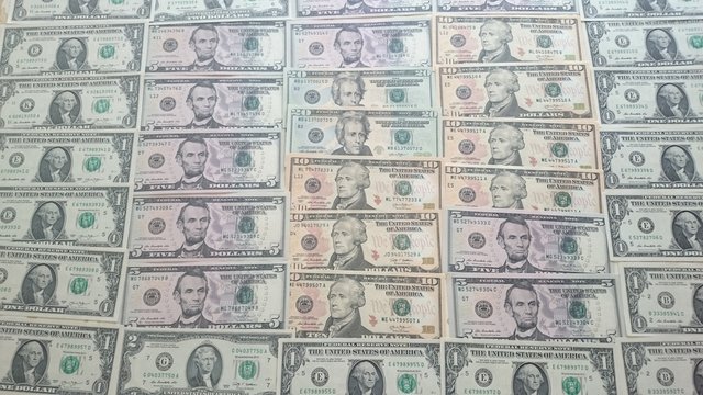 Top view of 20 rolled dollar bills on background made with one hundred dollar banknotes. Business concept