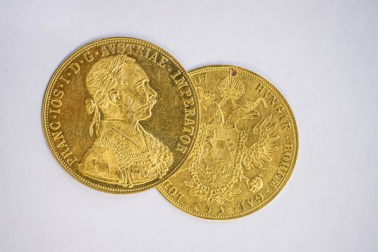 Close-up view of two on one another Austria-Hungary thalers, avers and revers of golden coin-ducats from 1915 with Kaiser Franz Joseph I, on white background