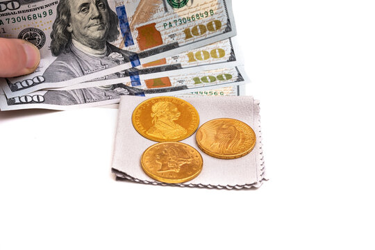 Austrian four ducats on US dollars. Investments in investment coins. The concept of buying gold. investment in gold.